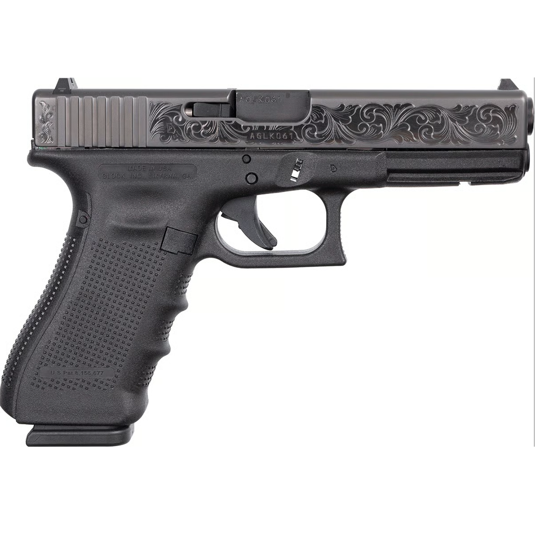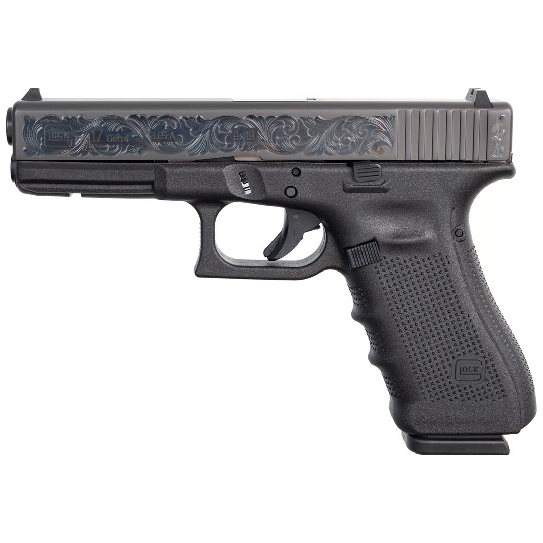 The Glock 17 Gen4 TALO Exclusive is a full-size, striker-fired 9mm pistol built for performance and collectability. This exclusive edition features polished armory-grade cut engraved scrollwork, giving the pistol a refined, custom look while maintaining the rugged reliability GLOCK is known for.